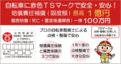 自転車対歩行者の事故が急増しています。安全整備店が点検整備をしてから貼るTSマークには賠償責任保険と傷害保険が付いているから安心です。